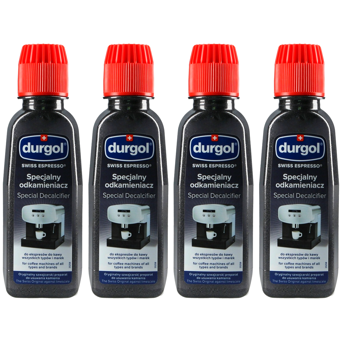 Odkamieniacz do ekspresu DURGOL Swiss Espresso Specjalny 4 x 125ml. Durgol Swiss Espresso to jeden z najlepszych profesjonalnych odkamieniaczy do ekspresów dostępnych na rynku. Opatentowana technologia zapewnia czyszczenie ekspresu ciśnieniowego każdej marki, nie tylko usuwając osad z kamienia, ale zabezpiecając elementy wewnętrzne przed jego osadzaniem się w przyszłości!