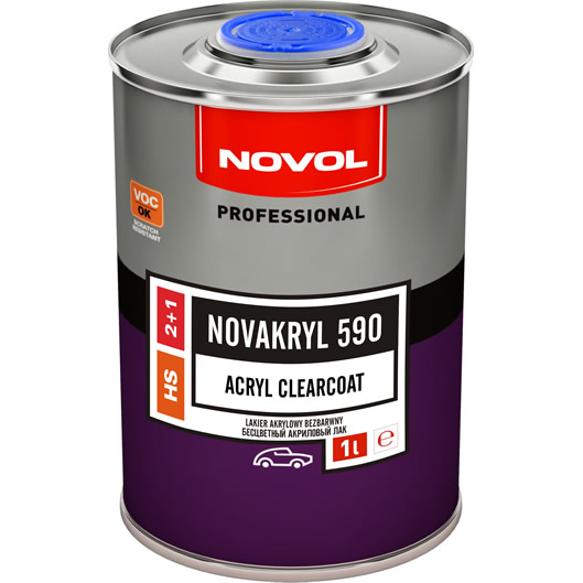 NOVOL Novacryl 590 to bezbarwny lakier akrylowy o dużej zawartości części stałych i o zwiększonej odporności na zarysowania (SR Scratch Resistant). Wysoka twardość, odporność na UV i warunki atmosferyczne gwarantują wysoką trwałość, a połysk i „głębia” znakomity wygląd lakierowanej powierzchni. Zalecaną grubość powłoki uzyskujemy przy aplikacji lakieru na półtorej warstwy. Dobra rozlewność i szybkie wysychanie zapewniają łatwą naprawę i krótki czas przebywania w kabinie lakierniczej. Występuje w wersji z utwardzaczem wolnym, standardowym lub szybkim. Wybór odpowiedniego utwardzacza uzależniony jest od warunków aplikacji. Ze względu na swoje właściwości NOVAKRYL 590 jest lakierem pozwalającym na łatwe odwzorowanie oryginalnej struktury fabrycznej lakieru.