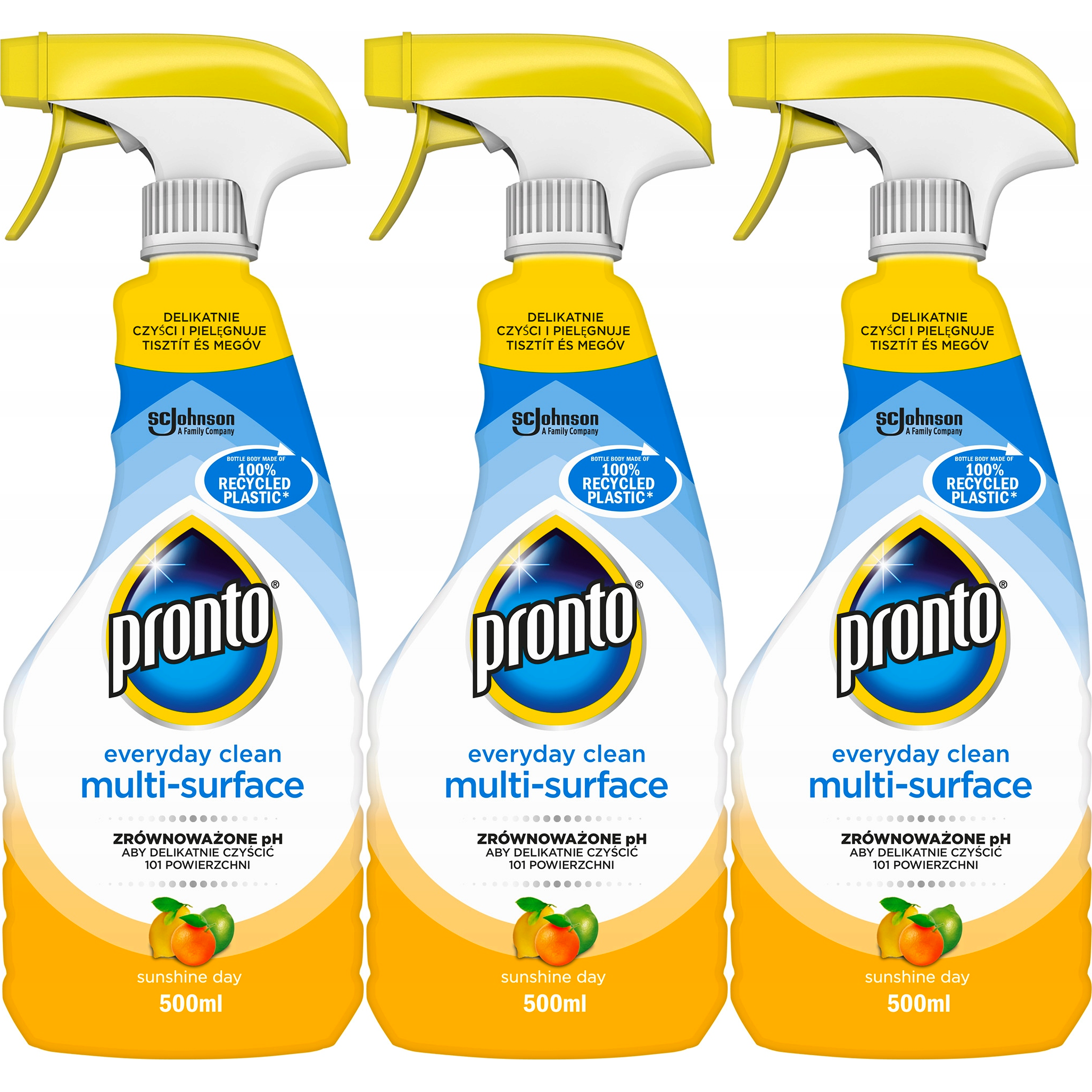 Czyszczenie wielofunkcyjne PRONTO Multi Surface Clean Spray 3 x 500ml. Pronto Everyday Clean Multi Surface 4718027 to środek czyszczący o zrównoważonym pH do stosowania na różnych powierzchniach w całym domu. Przeznaczony do usuwania zabrudzeń, jednak wystarczająco delikatny do codziennego użytku. Nasza formuła delikatnie czyści większość twardych powierzchni, usuwając kurz i zabrudzenia bez uszkadzania powierzchni oraz bez pozostawiania smug i osadów pozostawia jedynie piękny dom. Nie zawiera silikonu.
