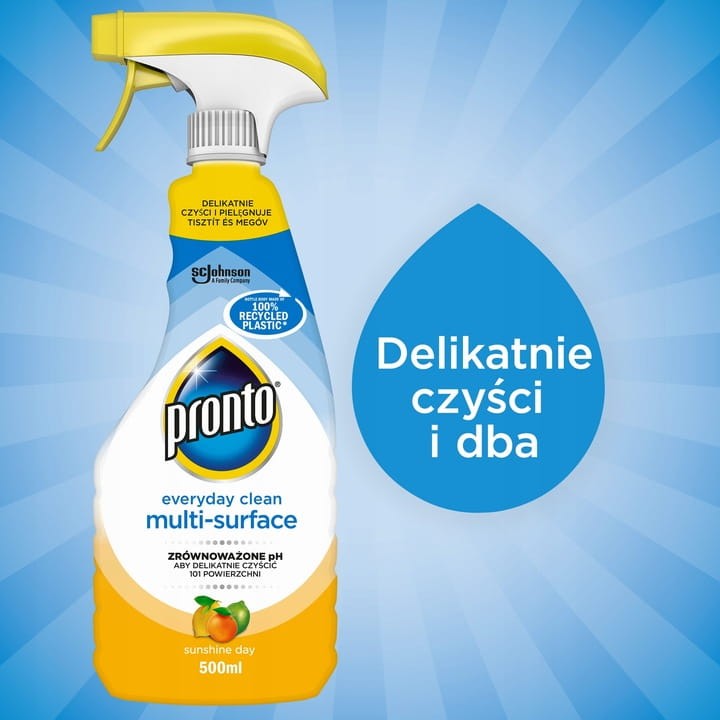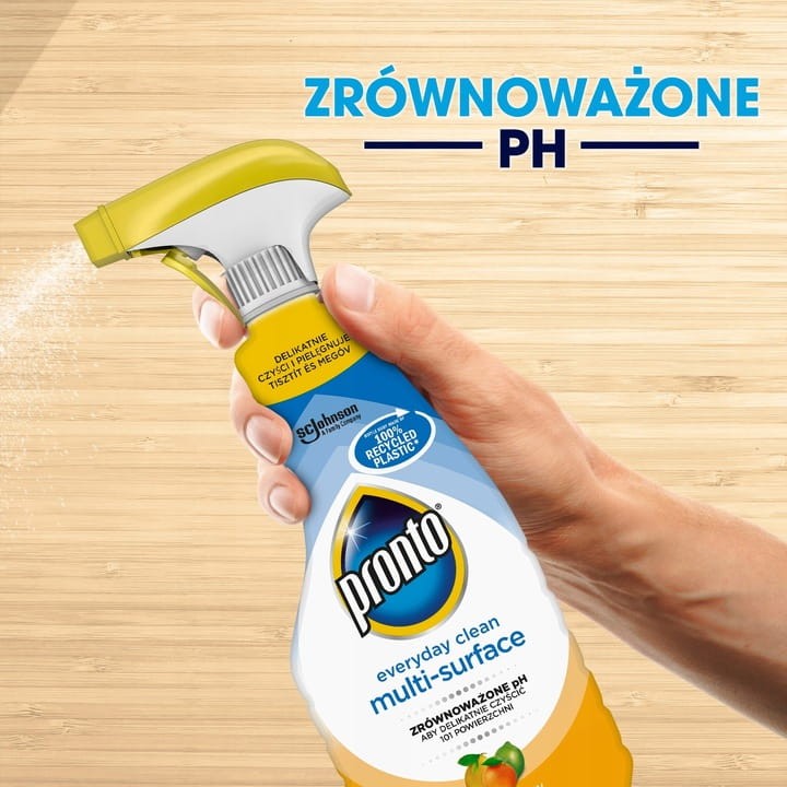 Utrzymanie domu w czystości to podstawa. Niestety podczas czyszczenia delikatne powierzchnie mogą z czasem ulec uszkodzeniu. Właśnie dlatego Pronto Everyday Clean MultiSurface posiada uniwersalną formułę o zrównoważonym pH, aby delikatnie czyścić i dbać o twoje powierzchnie. Za pomocą uniwersalnego środka czyszczącego możesz uzyskać pożądaną czystość, bez kurzu, zachowując jednocześnie naturalne piękno swoich powierzchni. A dzięki przyjemnemu cytrusowemu zapachowi możesz jeszcze bardziej cieszyć się całym procesem czyszczenia. Pozbądź się zabrudzeń i ciesz się swoimi powierzchniami, które są zarówno czyste, jak i dobrze utrzymane dzięki Pronto Everyday Clean z odpowiednim balansem pH. Dodatkową zaletą jest to, że nie pozostawia smug ani pozostałości na aż 101 powierzchniach. Produkt można używać na szkle, lustrach, granicie, jako środek do czyszczenia płytek, na podłogach, marmurze, plastiku, porcelanie, drewnie, chromie i wielu, wielu innych. Pozwól więc swoim powierzchniom lśnić delikatnym i zrównoważonym pH.