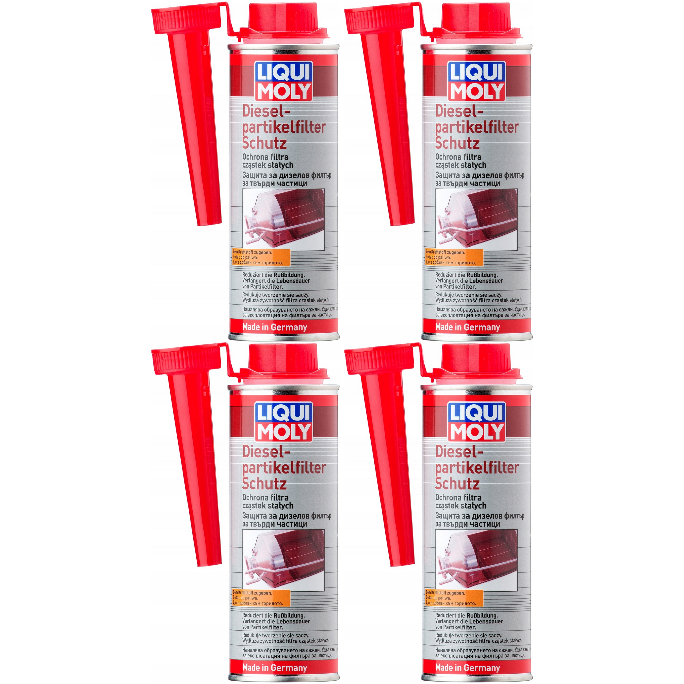 Dodatek do ochrony filtra DPF LIQUI MOLY Diesel Partikelfilter Schutz 1L (4 x 250ml) zapobiega powstawaniu sadzy, wydłuża żywotność filtra cząstek stałych. Jest doskonałym rozwiązaniem dla wszystkich użytkowników pojazdów z silnikami Diesla, których pojazdy poruszają się w ruchu miejskim i są narażone na przed wczesne zapchanie filtra cząstek stałych. Dodatek powoduje powstawanie mniejszej ilości sadzy, dlatego też regularne stosowanie zwiększa niezawodność oraz obniża koszty eksploatacji. Dodatek do ochrony filtra zapewnia optymalne spalanie paliwa i zmniejsza gromadzenie się cząstek stałych, co przyczynia się do redukcji emisji.