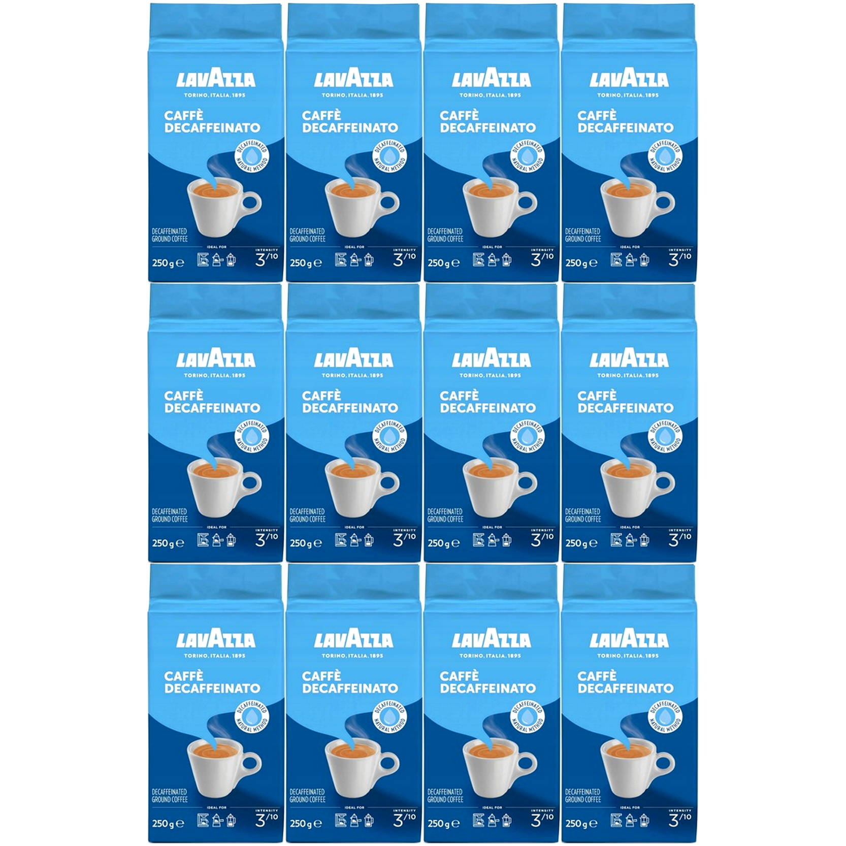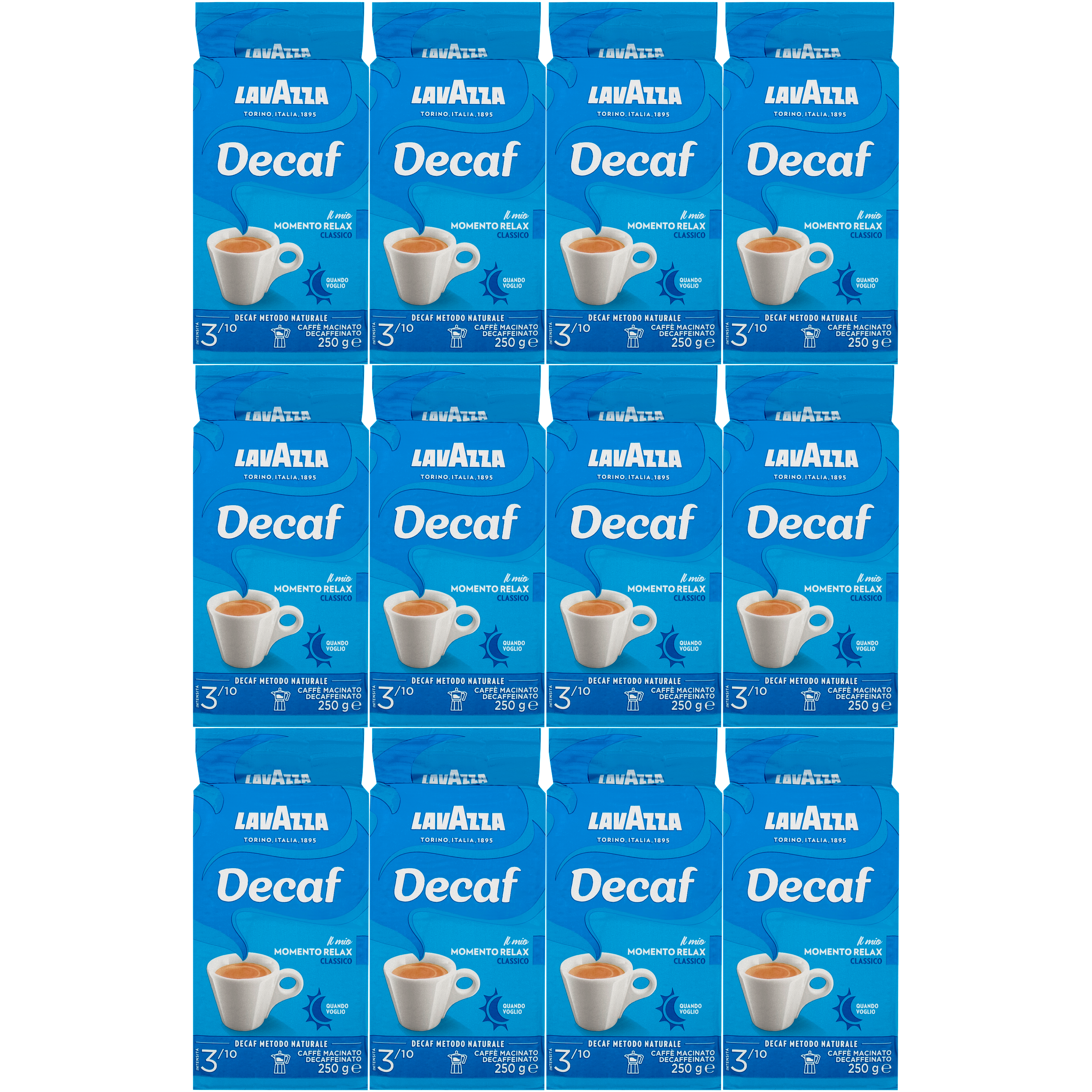 Kawa mielona bezkofeinowa LAVAZZA Dek Classico Decaf bez kofeiny 3000g (12 x 250g). Aromatyczna i dopracowana mieszanka wybranych kaw Robusta i Arabica, charakteryzująca się słodkimi nutami migdałów i czekolady mlecznej, a także suszonych owoców.