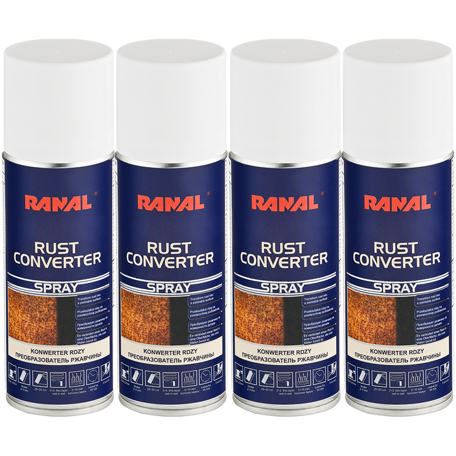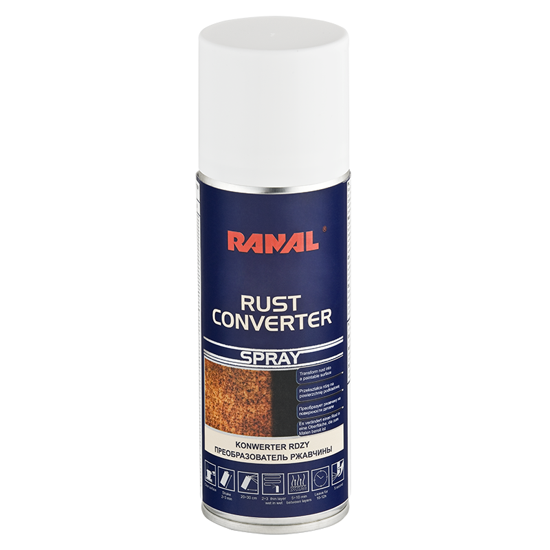 Konwerter rdzy RANAL Rust Converter Spray 4 x 200ml - konwerter rdzy w aerozolu jest podkładem przeznaczonym do powierzchni zardzewiałych. Dzięki swojej reaktywności z rdzą i żelazem przekształca on rdzę w stabilną warstwę bazową, która może być pokrywana większością farb dostępnych na rynku. PRODUKT DO UŻYTKU PROFESJONALNEGO!