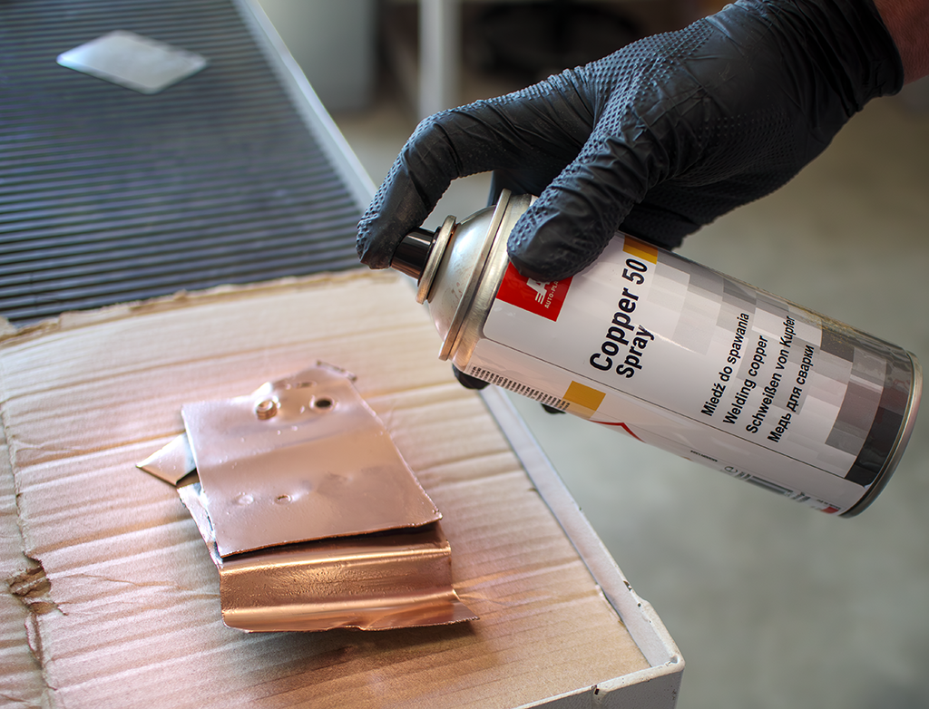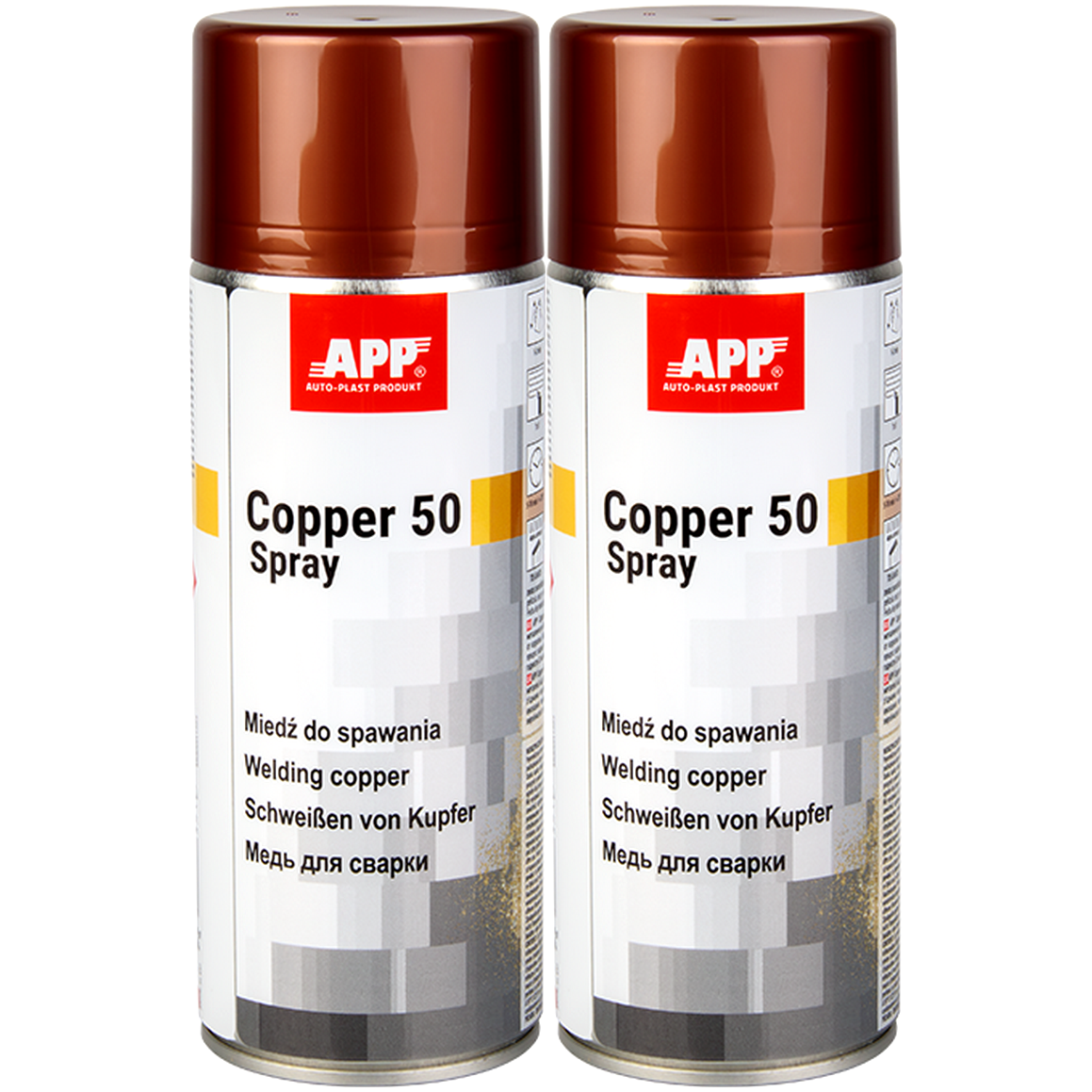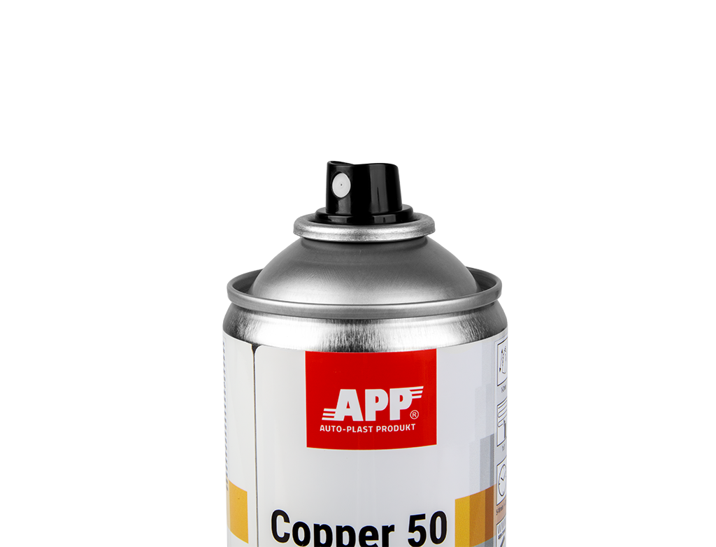 Miedź do spawania APP Copper 50 Antykorozyjny Spray 2 x 400ml. APP Copper 50 Spray to szybkoschnąca emalia, która w warstwie suchej zawiera 50% metalicznej miedzi. Stworzona do zabezpieczania przed korozją powierzchni zgrzewanych. Wysoka zawartość miedzi w powłoce oraz krótki czas schnięcia przyspieszają proces spawania, wpływając korzystnie na jakość połączenia.