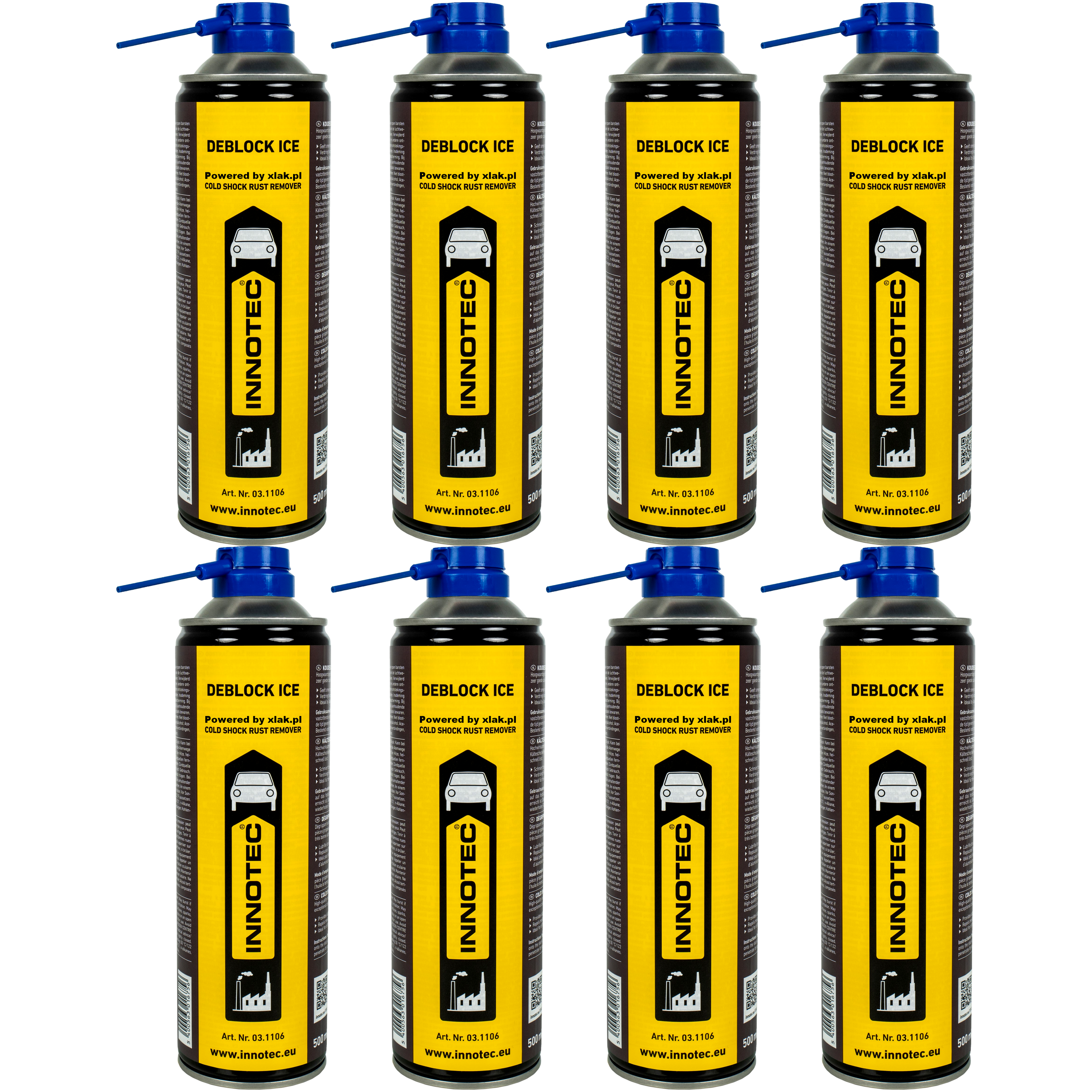 Odrdzewiacz smar antykorozyjny INNOTEC Deblock Ice Spray 8 x 500ml to potężny środek do usuwania rdzy na bazie MoS2, który dzięki doskonałemu połączeniu wyjątkowego efektu szoku termicznego (zamrażania) z mocnym działaniem kapilarnym umożliwia, w krótkim czasie łatwe poluzowanie zardzewiałych części, a tym samym ułatwia demontaż.