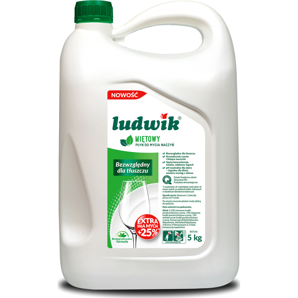 Płyn do mycia naczyń LUDWIK Miętowy mięta 5L. Ludwik płyn do mycia naczyń miętowy wydajny płyn o świeżym zapachu mięty. Nowa, bardziej skuteczna formuła myjącą zapewnia czyste i lśniące naczynia. Posiada biodegradowalną formułę i jest bezwzględny dla tłuszczu, pH neutralne dla skóry i dlatego jest łagodny dla dłoni. Zawiera wyciąg z aloesu.