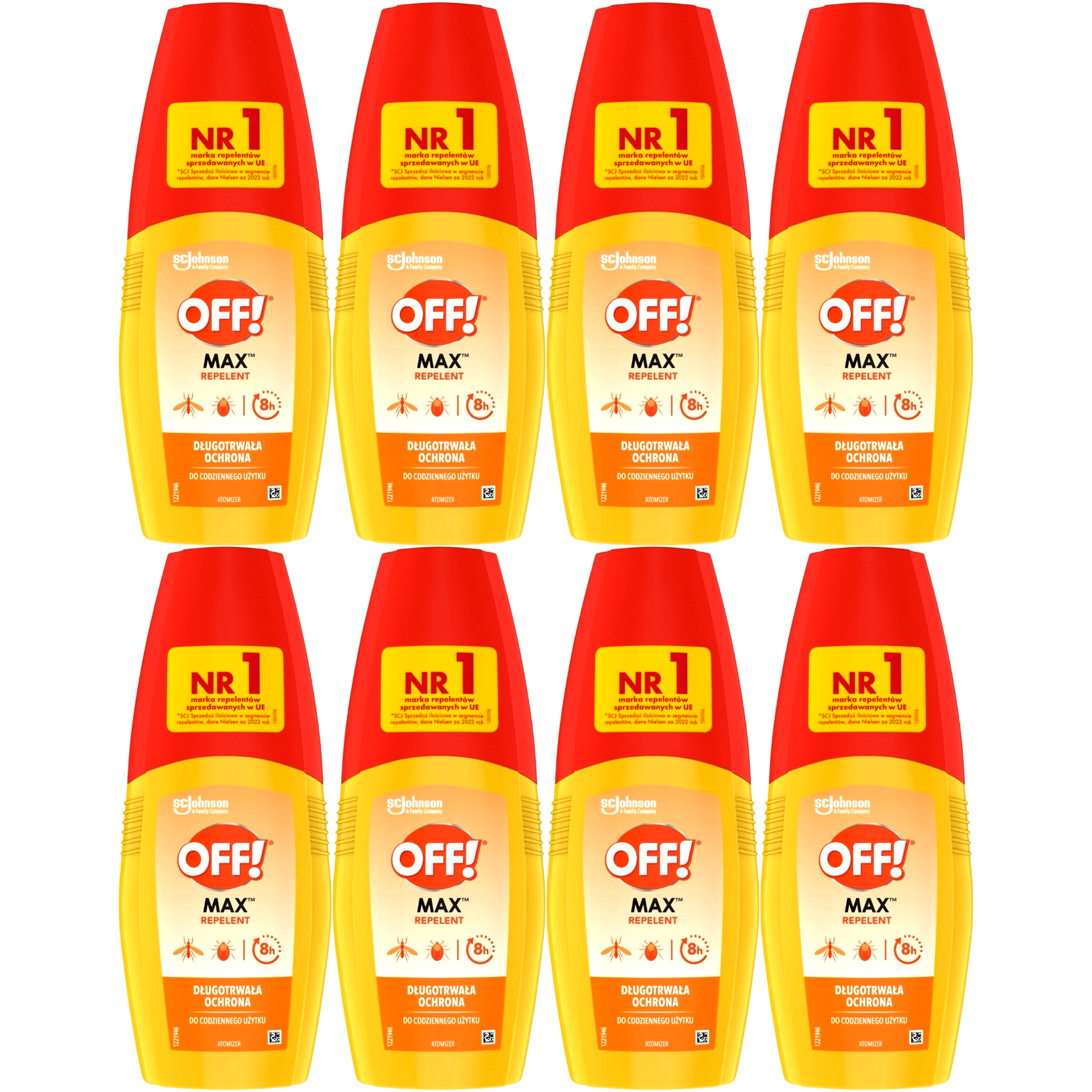 Płyn na komary kleszcze owady OFF! Max Repelent 8h 8x100 800ml. OFF! Max atomizer spray przeciw komarom i kleszczom to środek odstraszający owady, który chroni Ciebie i Twoją rodzinę przed komarami, komarami tygrysimi i kleszczami aż do 8 godzin.