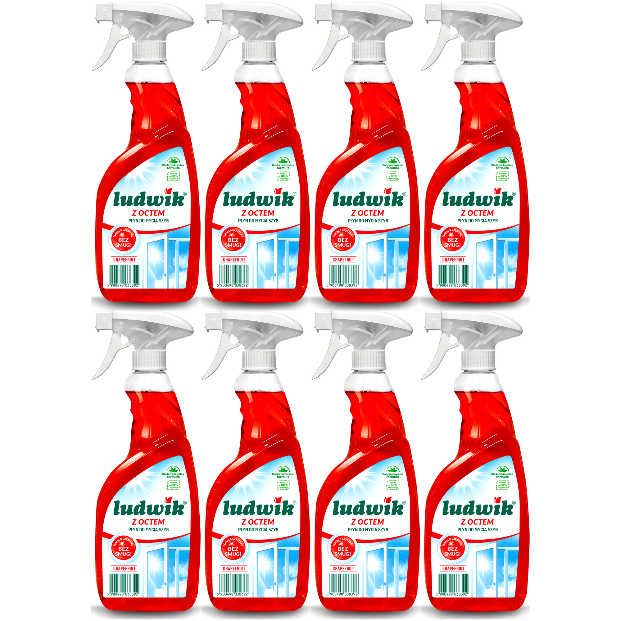 Płyn do mycia z octem LUDWIK Grapefruit mycie glazury szyb Spray 8 x 600 ml (4,8L). Ludwik Płyn do mycia szyb i glazury z octem. Ludwik płyn do szyb i glazury z octem. Nie pozostawia smug i zacieków. Skutecznie rozpuszcza zabrudzenia, odtłuszcza czyszczone powierzchnie i szybko odparowuje.