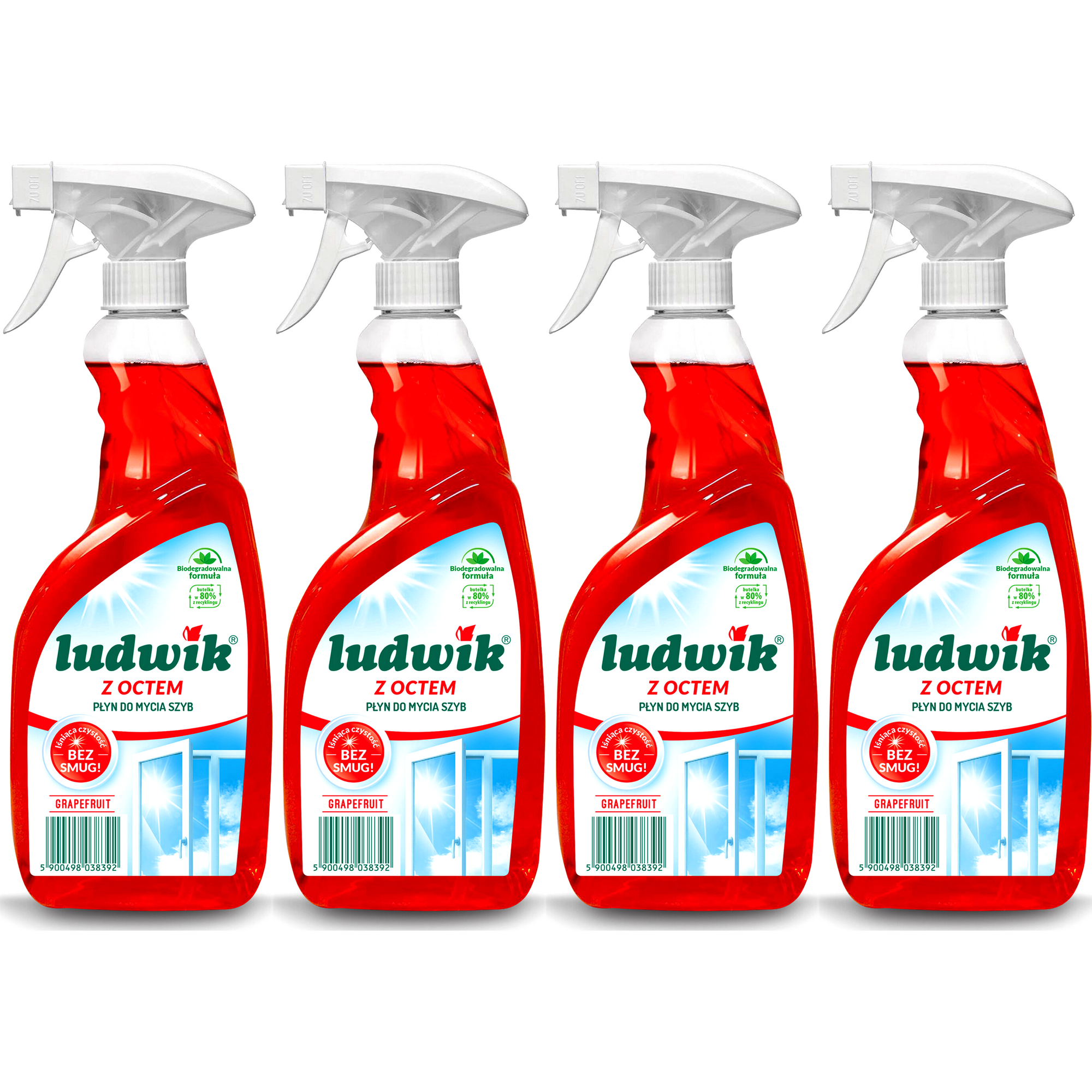 Płyn do mycia z octem LUDWIK Grapefruit mycie glazury szyb Spray 4 x 600 ml (2,4L). Ludwik Płyn do mycia szyb i glazury z octem. Ludwik płyn do szyb i glazury z octem. Nie pozostawia smug i zacieków. Skutecznie rozpuszcza zabrudzenia, odtłuszcza czyszczone powierzchnie i szybko odparowuje.