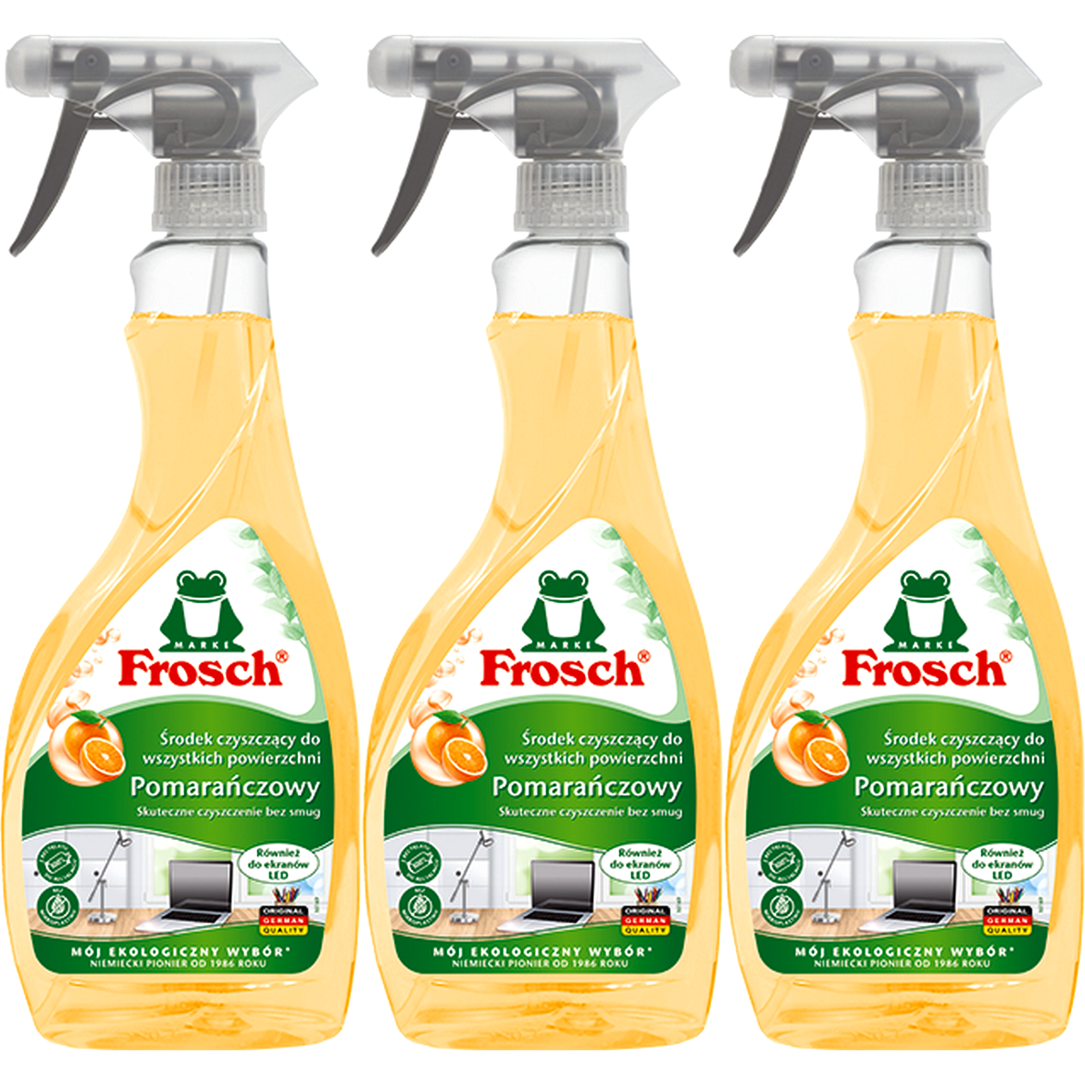 Środek czyszczący do wszystkich powierzchni FROSCH Pomarańczowy uniwersalny Spray 1,5L (3 x 500ml). Skuteczne czyszczenie bez smug. Uniwersalne zastosowanie do wszelkiego rodzaju przecieralnych powierzchni.