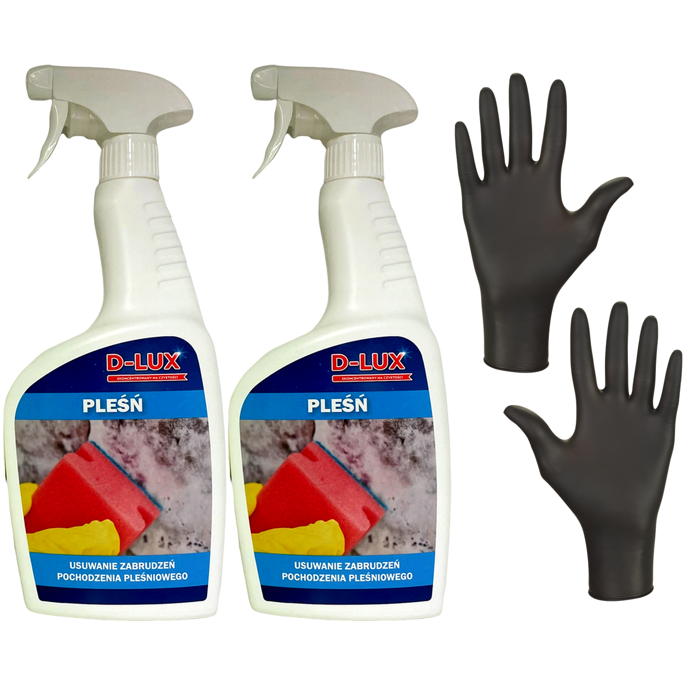 Preparat do usuwania pleśni i grzybów D-LUX Spray 1L (2 x 500ml) + rękawice ochronne 2 szt. gratis. D-Lux na Pleśń na ścianie, podłodze, a może w okolicach okien lub za meblami? Problem ten spotyka niestety wiele osób. Nie tylko sam wygląd jest nieestetyczny, ale pleśń to także źródło grzybów i innych bakterii oraz nieprzyjemny zapach. Z problemem tym świetnie poradzi sobie D-LUX Płyn do pleśni, który znajduje się w naszej ofercie.