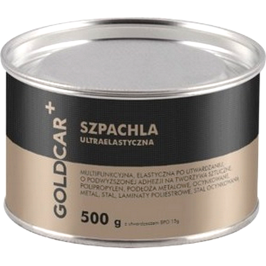Szpachlówka ultraelastyczna GOLDCAR+ multifunkcyjna 500g to uniwersalna szpachla o bardzo wysokiej elastyczności przeznaczona głównie do podłoży z tworzyw sztucznych, w tym do polipropylenu. Łatwa do aplikacji i modelowania. Posiada właściwości szpachli wypełniającej i wykończeniowej. Zapewnia wysoką jakość powłoki po obróbce mechanicznej, nie zostawia dziurek, porów. Wykazuje bardzo dobrą adhezję również do powierzchni metalowych (stal, stal ocynkowana, aluminium) i laminatów poliestrowych.