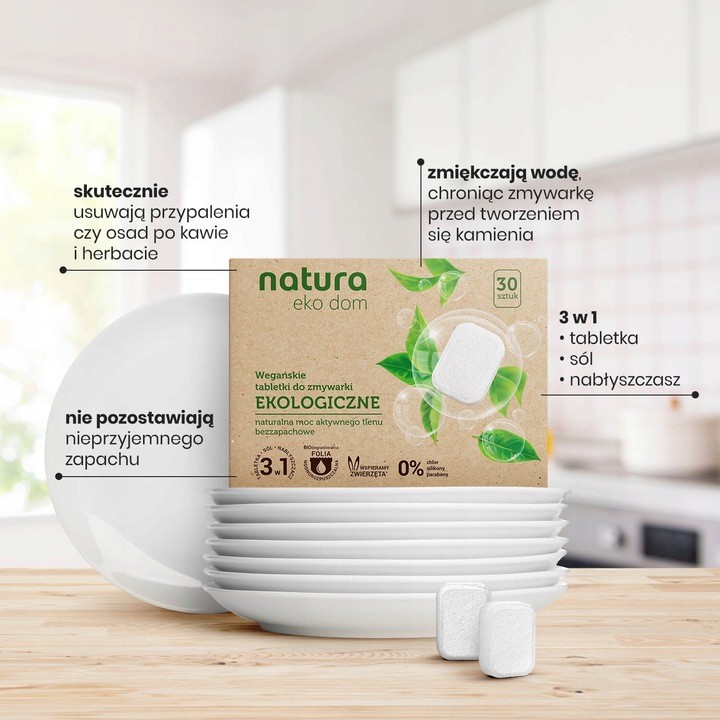 Ekologiczne Tabletki Do Zmywarki Wegańskie NATURA Eko Dom 30 szt. Ekologiczne tabletki do zmywarki to niezwykłe połączenie skuteczności działania oraz nowoczesnej technologii opartej na wybielających związkach na bazie tlenu z troską o naturę.