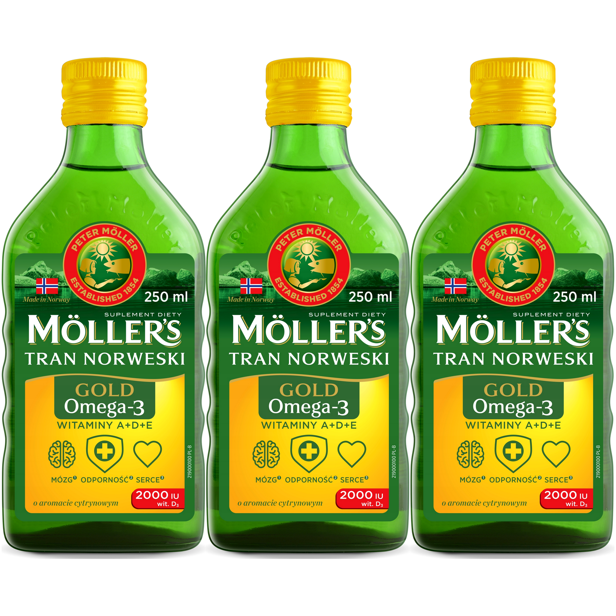 Tran norweski Mollers Gold Omega-3 Cytrynowy 2000 IU suplement 3 x 250ml (750ml). Moller's Gold Tran Norweski suplement diety Cytrynowy 250ml. Möllers Gold to przełomowy tran na polskim rynku. Jako jedyny tran łączy w sobie dzienną, tak wysoką dawkę witaminy D3 oraz kwasów omega-3.