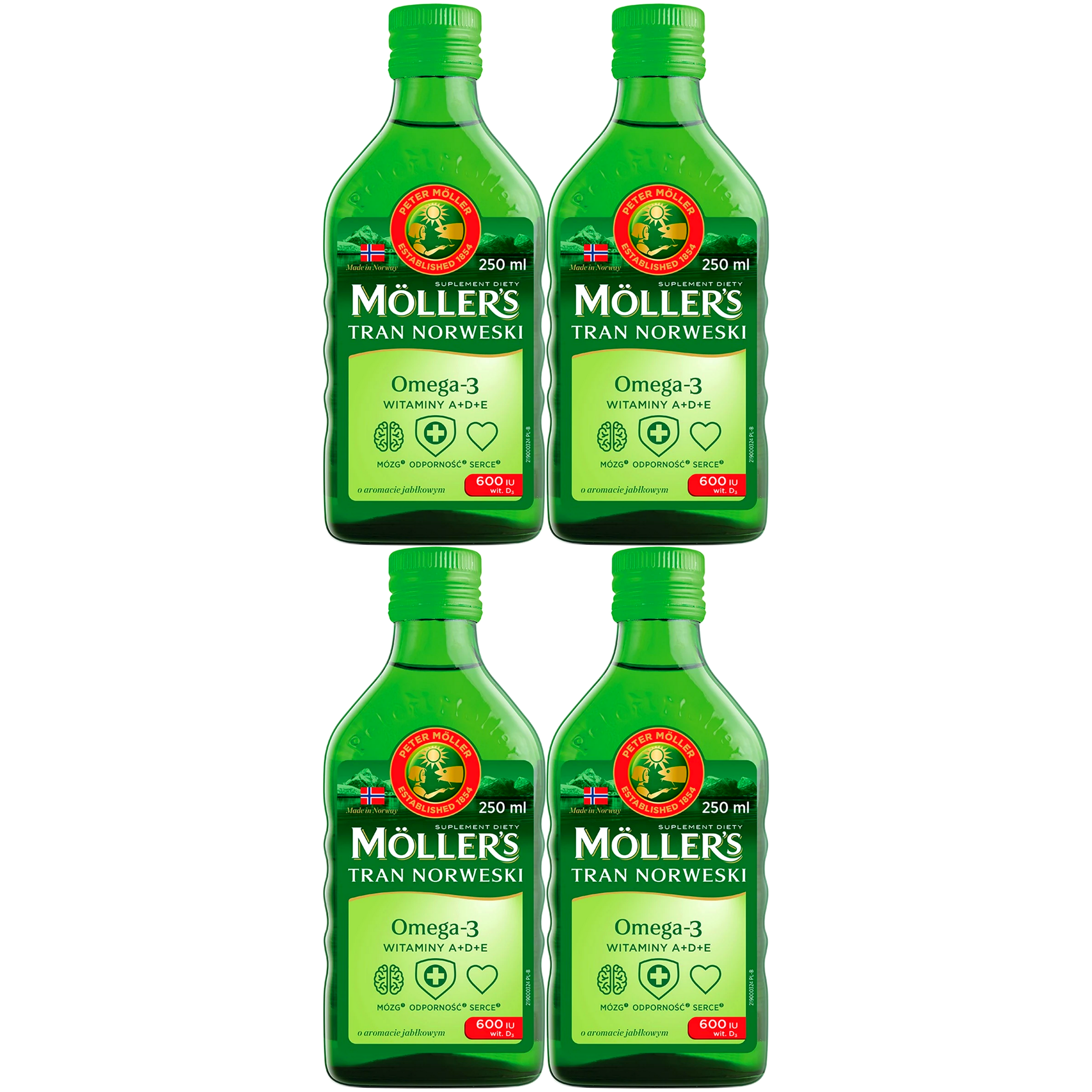 Tran norweski Mollers Gold Omega-3 Jabłkowy suplement na odporność 1L (4 x 250ml). Möller’s Tran Norweski – stanowi uzupełnienie codziennej diety w nienasycone kwasy tłuszczowe omega-3 oraz witaminy D3, A i E. Dostępny w trzech wariantach: naturalnym, cytrynowym i owocowym.