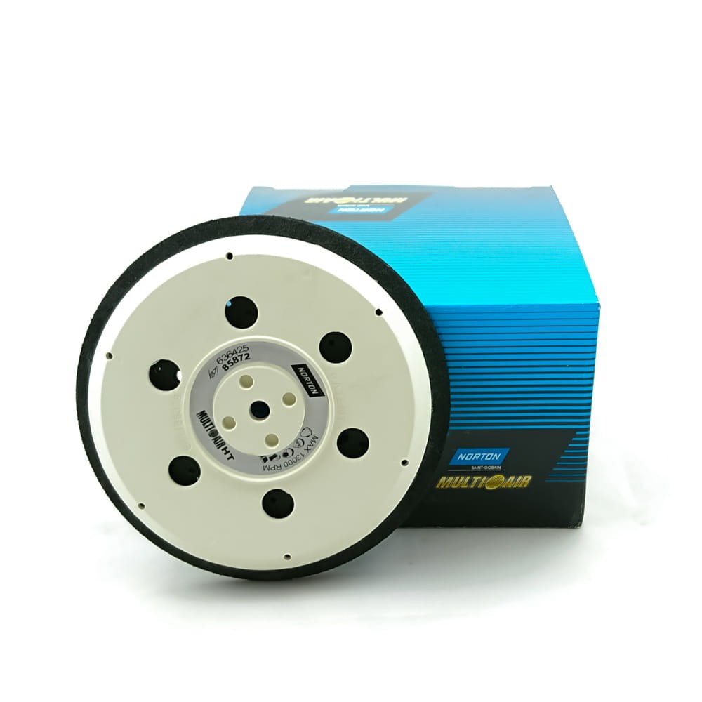 Uniwersalna podkładka do krążków na rzep NORTON Multi-Air, średnica 150mm. Wszystkie podkładki Multi-Air Process® pakowane są w pojedyncze opakowania z przejściówką Festo M8 i śrubami 5/16" oraz trzema fibrowymi podkładkami.