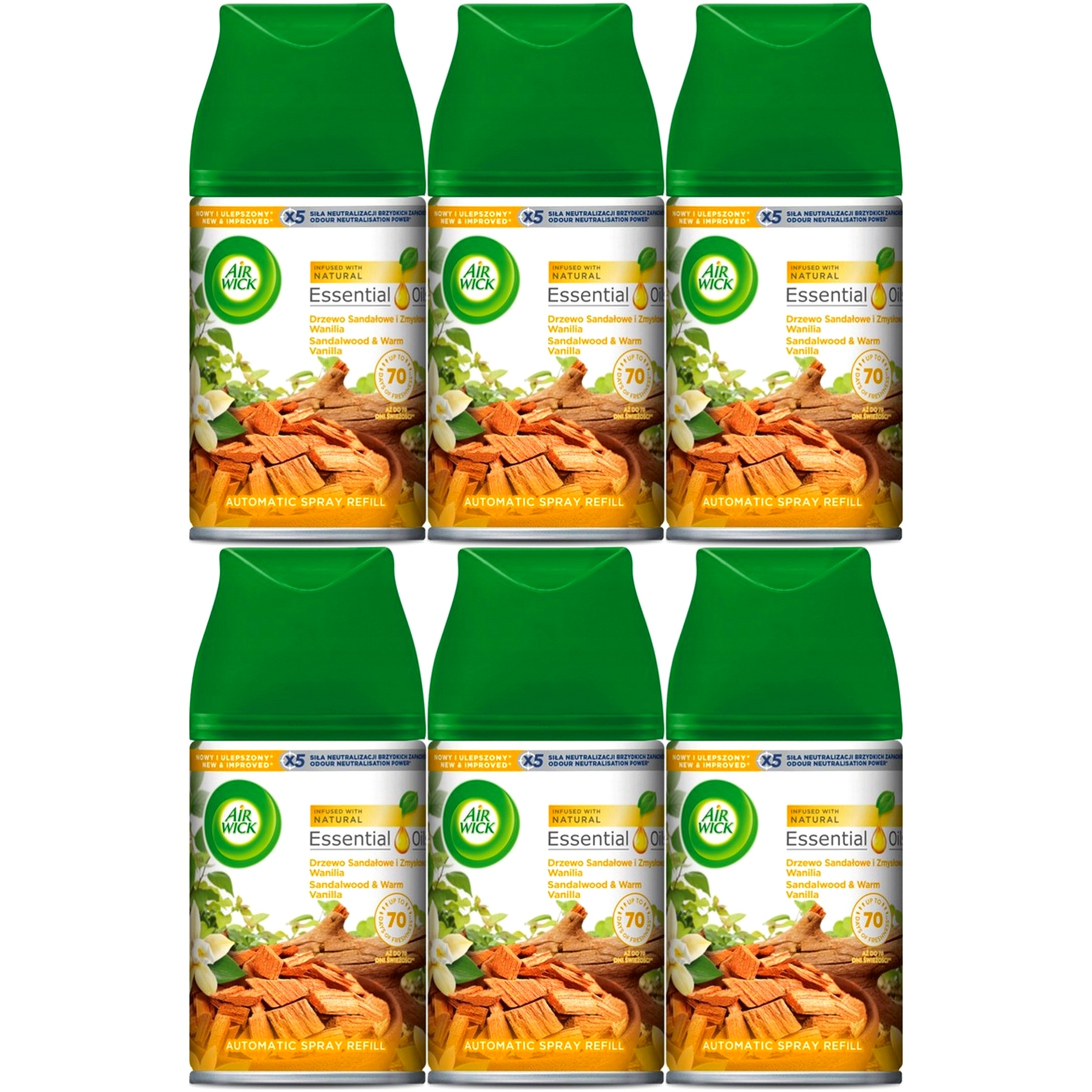 Wkład do automatycznego Odświeżacza Powietrza AIR WICK Drzewo Sandałowe i Wanilia 6 x 250ml. Air Wick Freshmatic wkład Drzewo Sandałowe i Zmysłowa Wanilia.