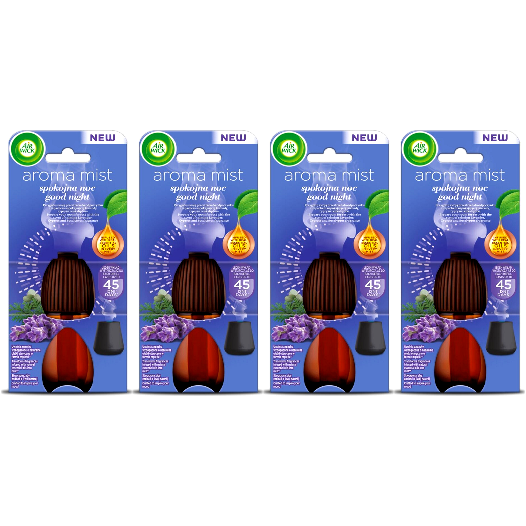 - Air Wick Aromatyczna Mgiełka Spokojna Noc uwalnia pachnącą mgiełkę nawet przez 45 dni*.
