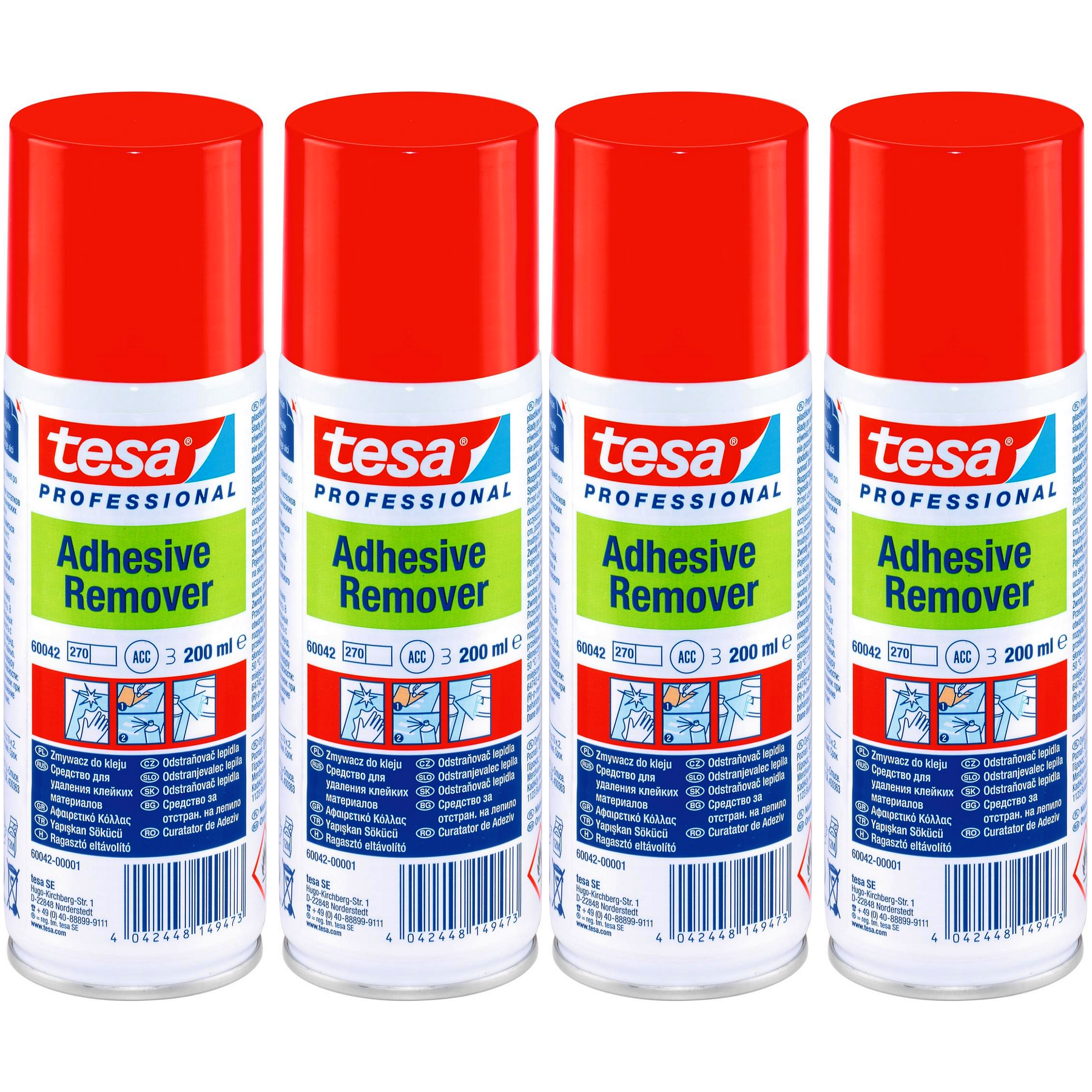 Zmywacz do kleju TESA Adhesive Remover 60042 etykiet naklejek taśm Spray 800ml (4 x 200ml). Zmywacz tesa® Adhesive Remover 60042 przeznaczony jest do łatwego usuwania pozostałości kleju z plastikowych elementów oraz szklanych i metalowych powierzchni.